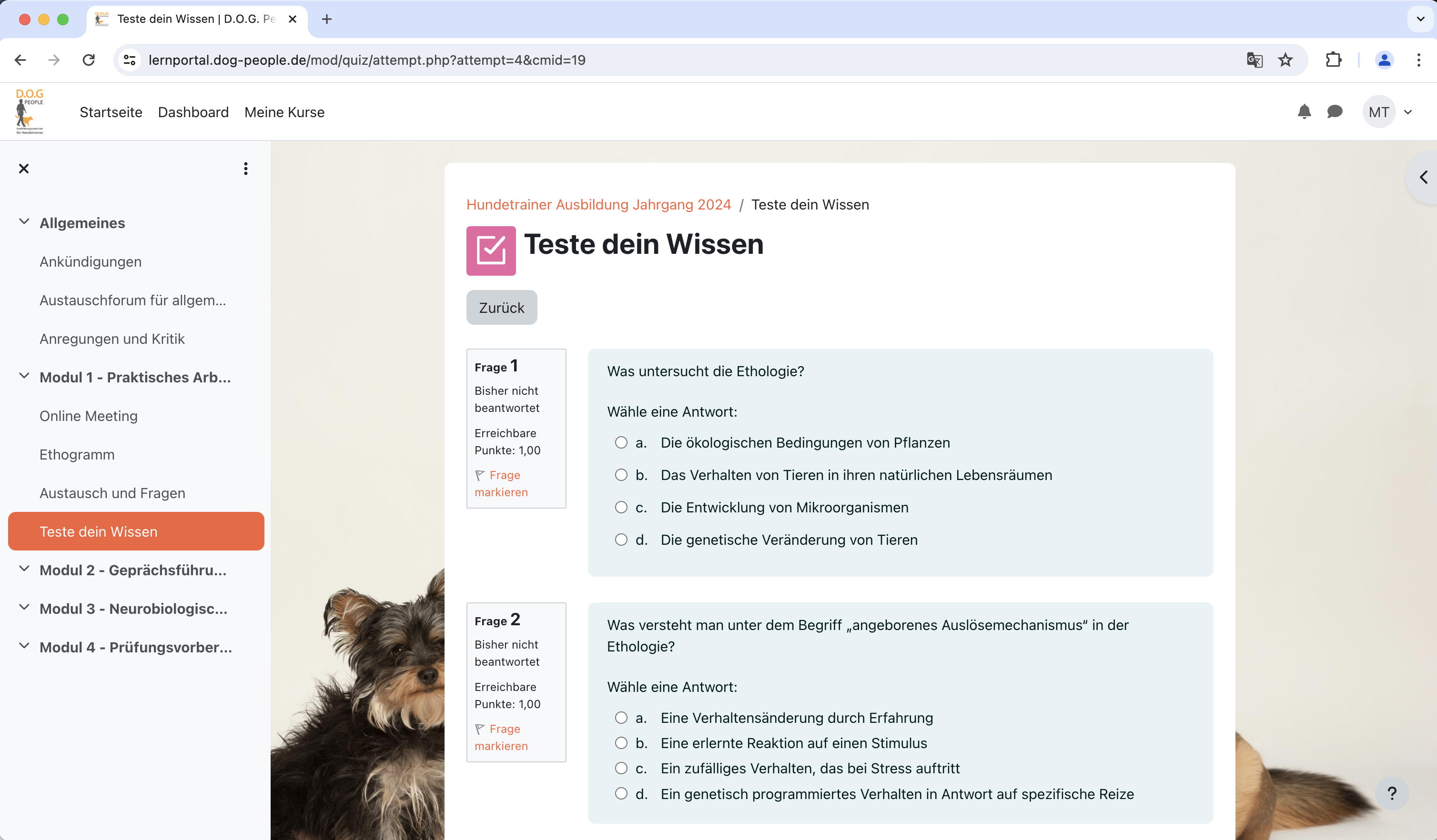 Durch die Nutzung unserer Plattform, die auf dem bewährten Moodle Lernsystem basiert, wird das Erlernen neuer Techniken und Methoden spielend leicht ermöglicht. Auch außerhalb des Seminarraums kann das Engagement aufrechterhalten und das Lernen selbst in die Hand genommen werden, um eine fortgeschrittene Hundetrainerausbildung zu gewährleisten.